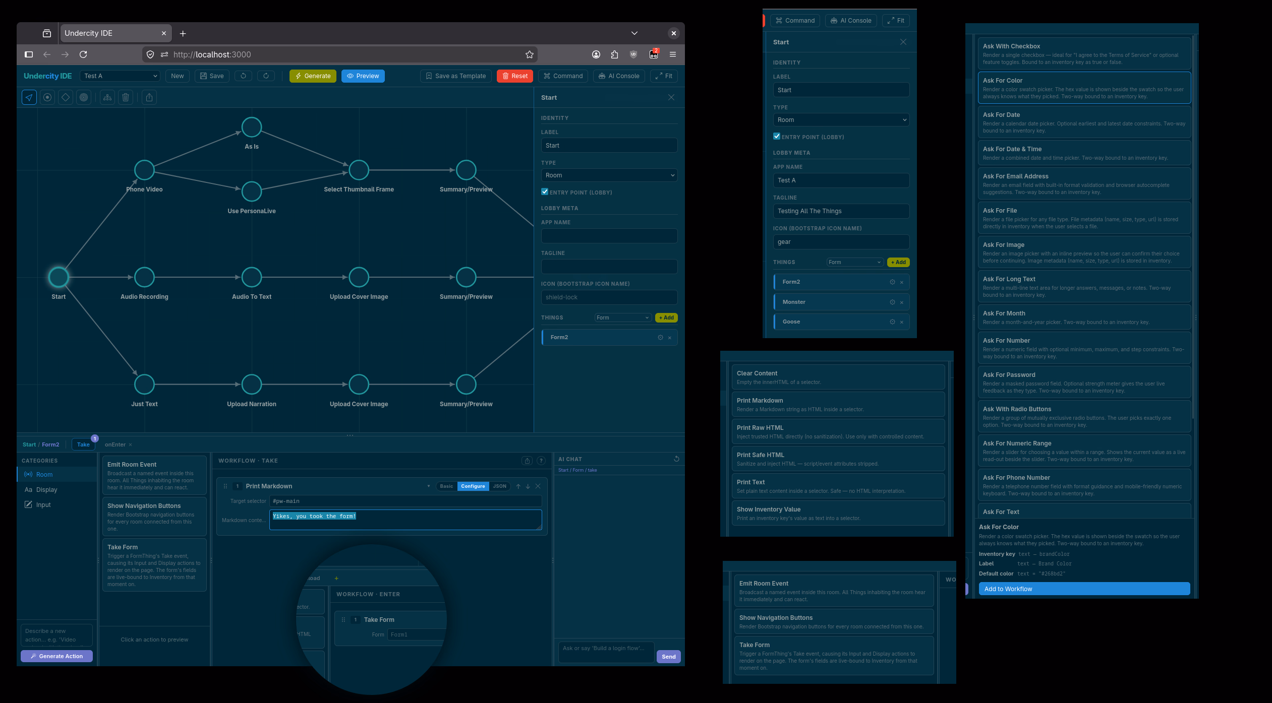 The author explains a minimal, event‑driven virtual world programming system—built around rooms, forms, and AI‑generated UI—that lets users create Things drag and drop user interfaces together while keeping full control over the programming and vision of the coherent system.